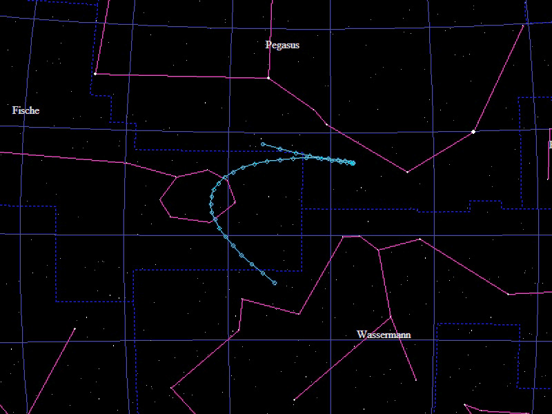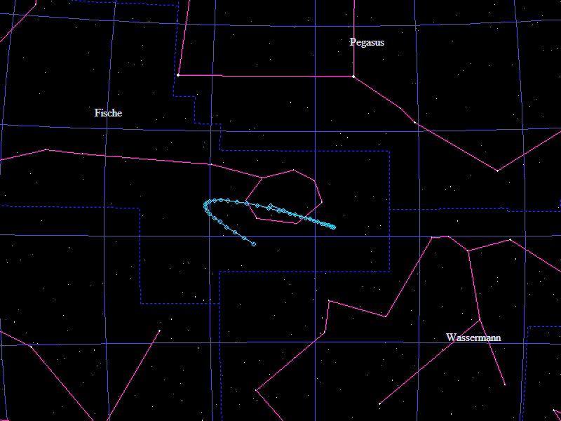 Die Oppositionsschleife von (474495) 2003 UH4 im Jahr 2016 im Grenzgebiet der Sternbilder "Fische" und "Pegasus". Eingezeichnet sind die Positionen zwischen dem 10.6. und dem 6.12.2016 mit jeweils 5 Tagen Abstand. Die maximale Helligkeit des Kleinplaneten beträgt gerade einmal 19,9mag.