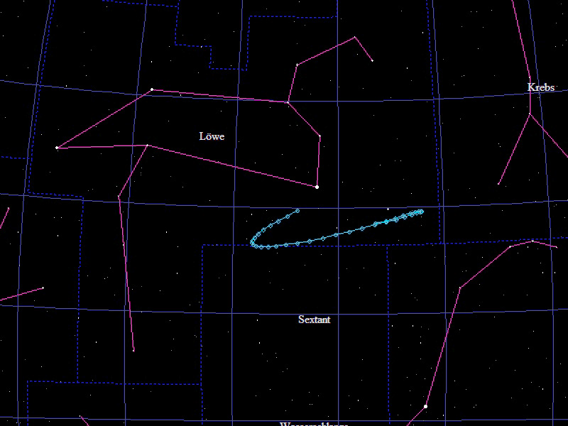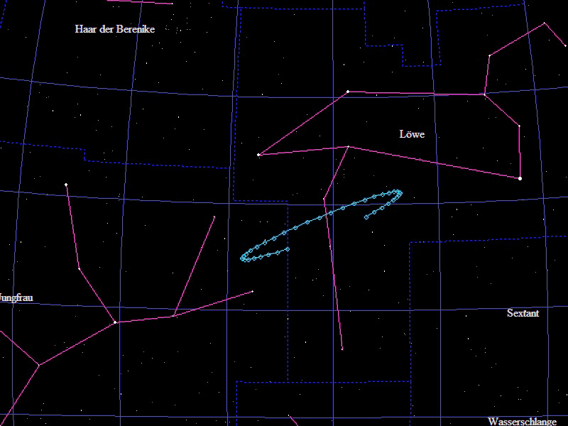 Die Oppositionsschleife von (12053) Turtlestar im Jahr 2014 im Grenzgebiet der Sternbilder "Löwe" und "Sextant". Eingezeichnet sind die Positionen zwischen dem 20.11.2013 und dem 18.5.2014 mit jeweils 5 Tagen Abstand. Die maximale Helligkeit des Kleinplaneten beträgt 17,5mag.