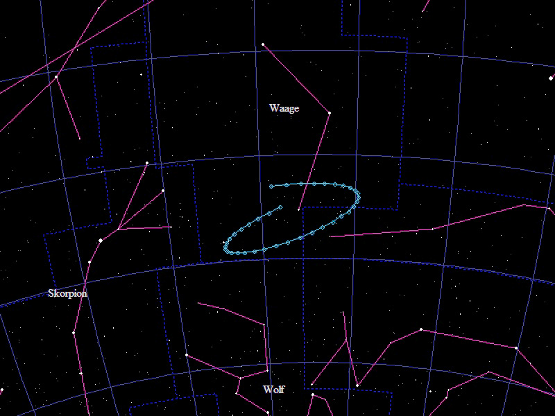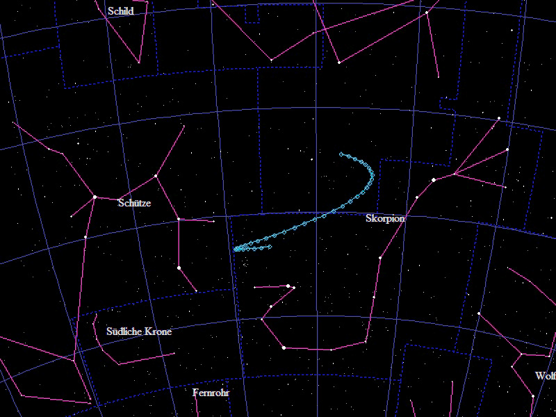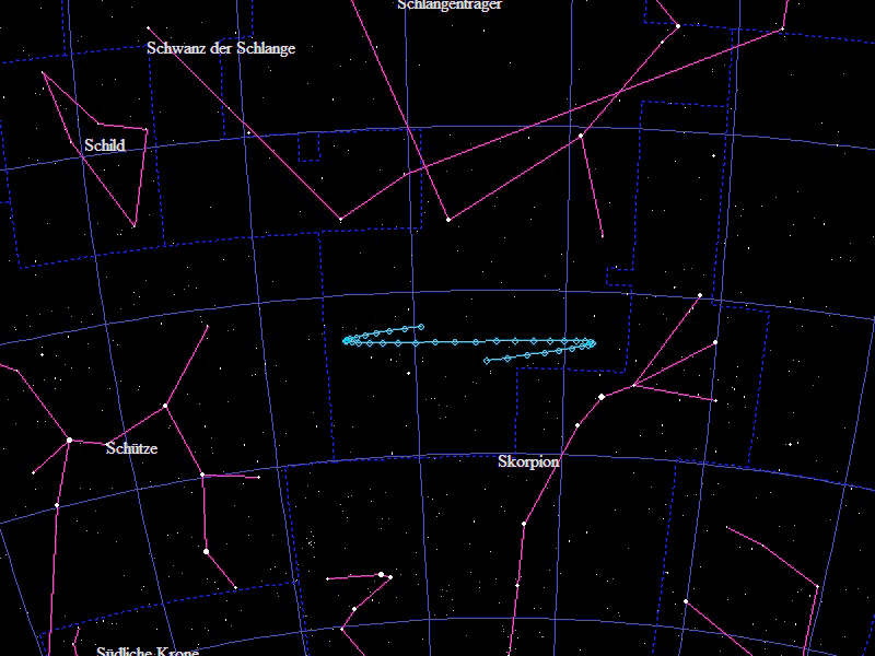 Die Oppositionsschleife von (133552) Itting-Enke im Jahr 2018 im Grenzgebiet der Sternbilder "Skorpion" und "Schlangenträger". Eingezeichnet sind die Positionen zwischen dem 15.3. und dem 10.9.2018 mit jeweils 5 Tagen Abstand. Die maximale Helligkeit des Kleinplaneten beträgt 19,2mag.