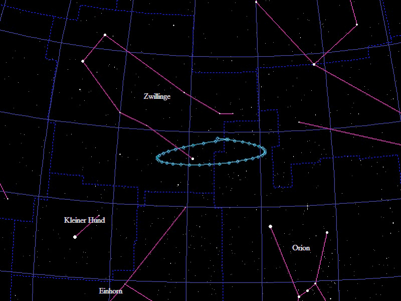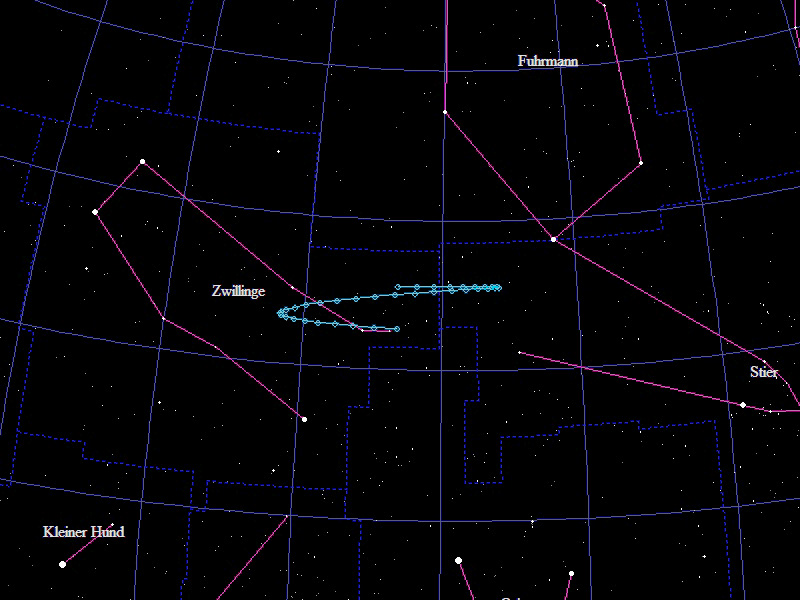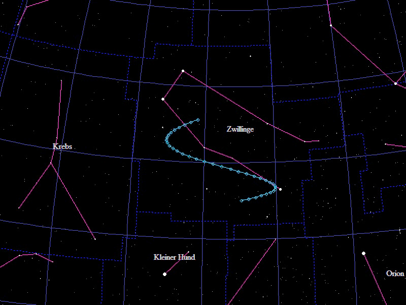 Die Oppositionsschleife von (15924) Axelmartin im Jahr 2016 im Grenzgebiet der Sternbilder "Stier" und "Zwillinge". Eingezeichnet sind die Positionen zwischen dem 25.9.2016 und dem 23.3.2017 mit jeweils 5 Tagen Abstand. Die maximale Helligkeit des Kleinplaneten beträgt 17,3mag.