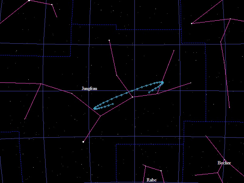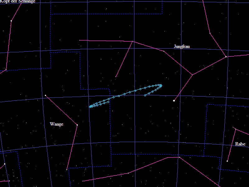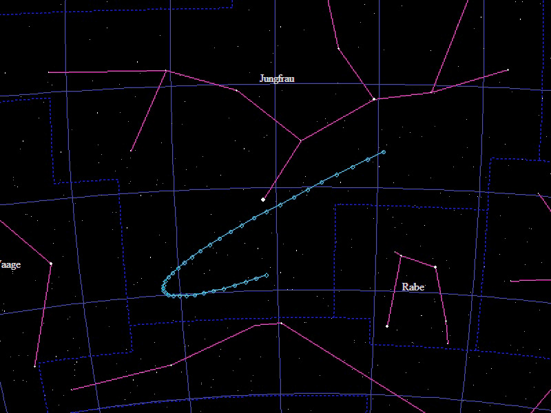 Die Oppositionsschleife von (15924) Axelmartin im Jahr 2014 im Grenzgebiet der Sternbilder "Löwe" und "Jungfrau". Eingezeichnet sind die Positionen zwischen dem 10.12.2013 und dem 7.6.2014 mit jeweils 5 Tagen Abstand. Die maximale Helligkeit des Kleinplaneten beträgt 18,7mag.