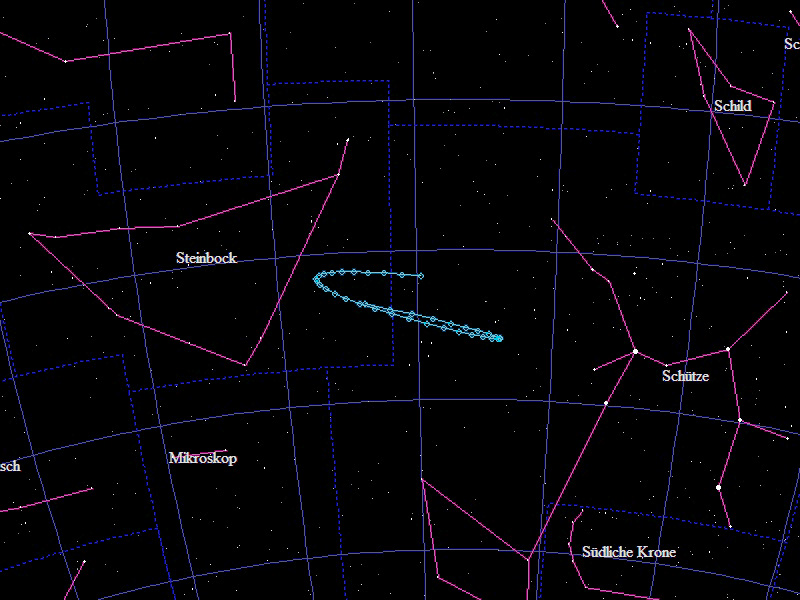 Die Oppositionsschleife von (15924) Axelmartin im Jahr 2019 im Grenzgebiet der Sternbilder "Schütze" und "Steinbock". Eingezeichnet sind die Positionen zwischen dem 25.4. und dem 21.10.2019 mit jeweils 5 Tagen Abstand. Die maximale Helligkeit des Kleinplaneten beträgt 17,0mag.