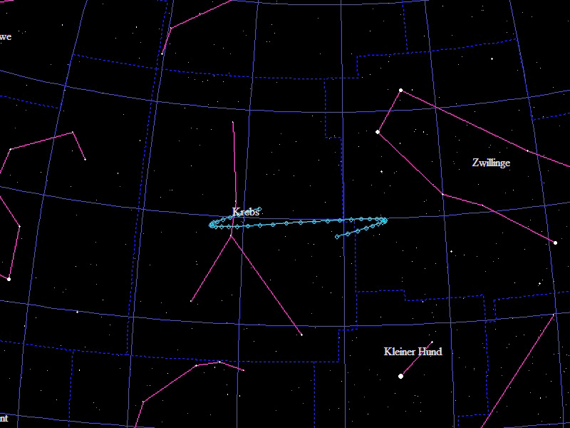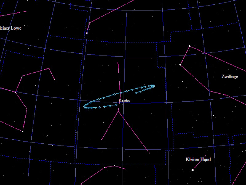 Die Oppositionsschleife von (15924) Axelmartin im Jahr 2021 im Sternbild "Krebs". Eingezeichnet sind die Positionen zwischen dem 25.10.2020 und dem 22.4.2021 mit jeweils 5 Tagen Abstand. Die maximale Helligkeit des Kleinplaneten beträgt 18,1mag.
