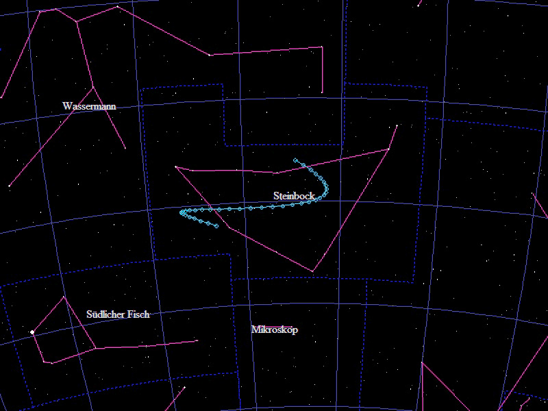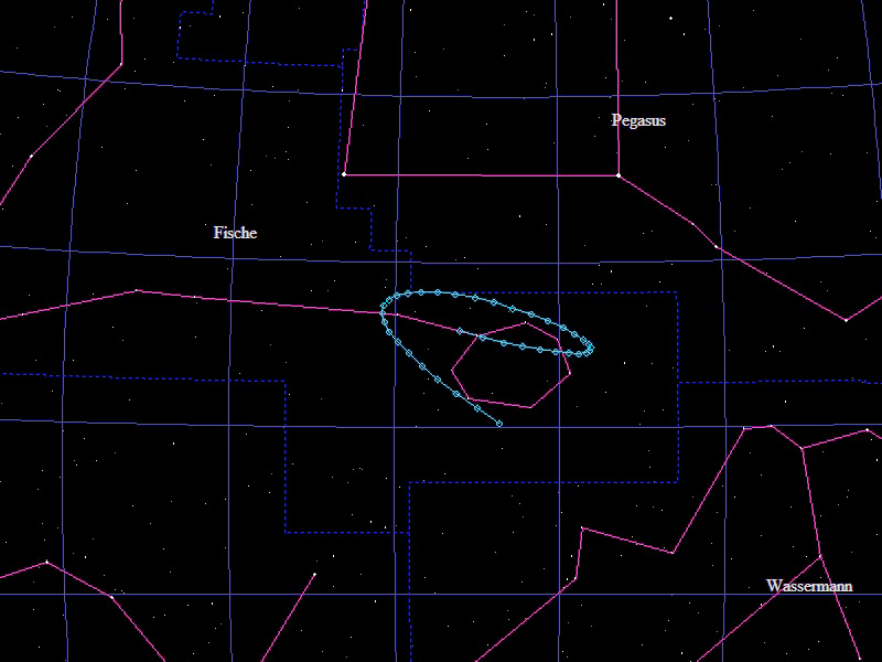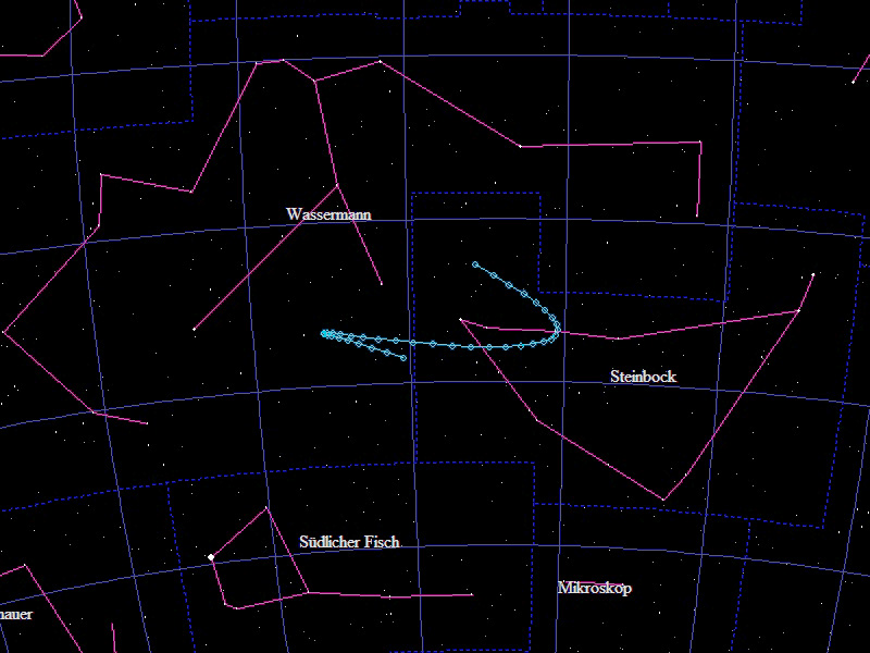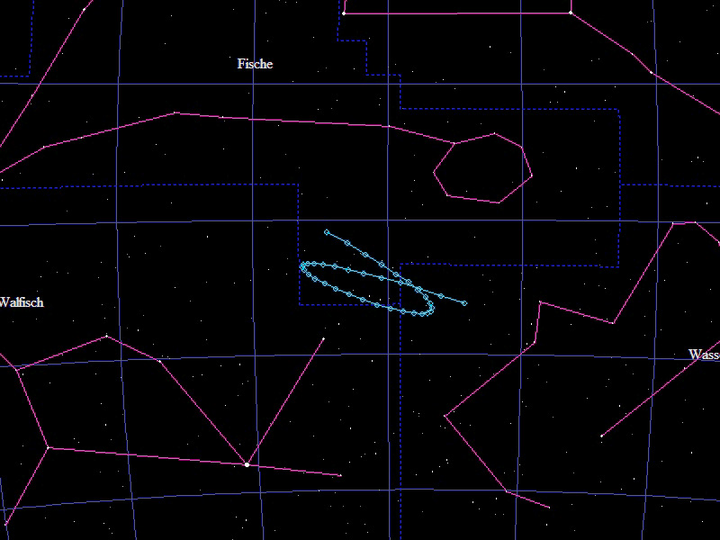 Die Oppositionsschleife von (15924) Axelmartin im Jahr 2023 im Grenzgebiet der Sternbilder "Wassermann", "Fische" und "Walfisch". Eingezeichnet sind die Positionen zwischen dem 20.6. und dem 16.12.2023 mit jeweils 5 Tagen Abstand. Die maximale Helligkeit des Kleinplaneten beträgt 16,4mag.