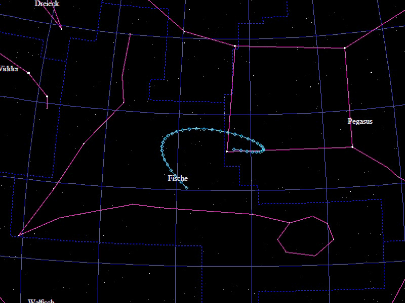 Die Oppositionsschleife von (191494) Berndkoch im Jahr 2014 im Grenzgebiet der Sternbilder "Fische" und "Pegasus". Eingezeichnet sind die Positionen zwischen dem 1.7. und dem 27.12.2014 mit jeweils 5 Tagen Abstand. Die maximale Helligkeit des Kleinplaneten beträgt 19,2mag.