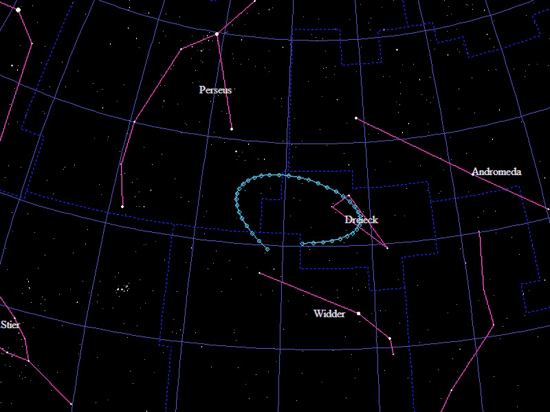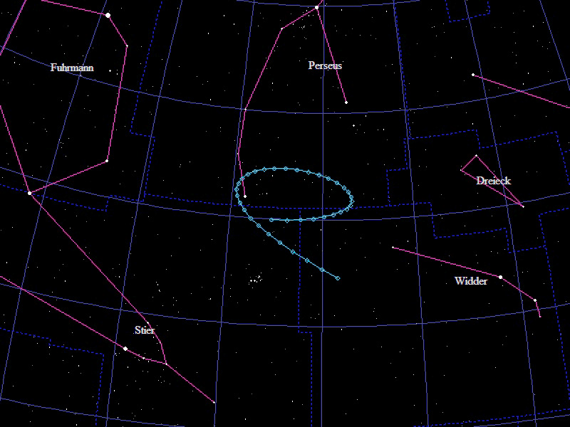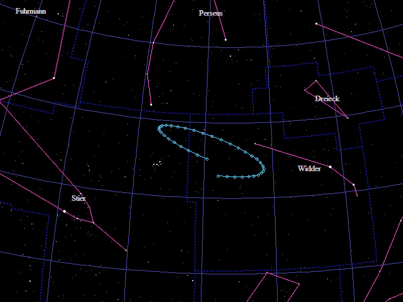 Die Oppositionsschleife von (191494) Berndkoch im Jahr 2020 im Grenzgebiet der Sternbilder "Widder", "Perseus" und "Dreieck". Eingezeichnet sind die Positionen zwischen dem 10.8.2020 und dem 5.2.2021 mit jeweils 5 Tagen Abstand. Die maximale Helligkeit des Kleinplaneten beträgt 19,3mag.
