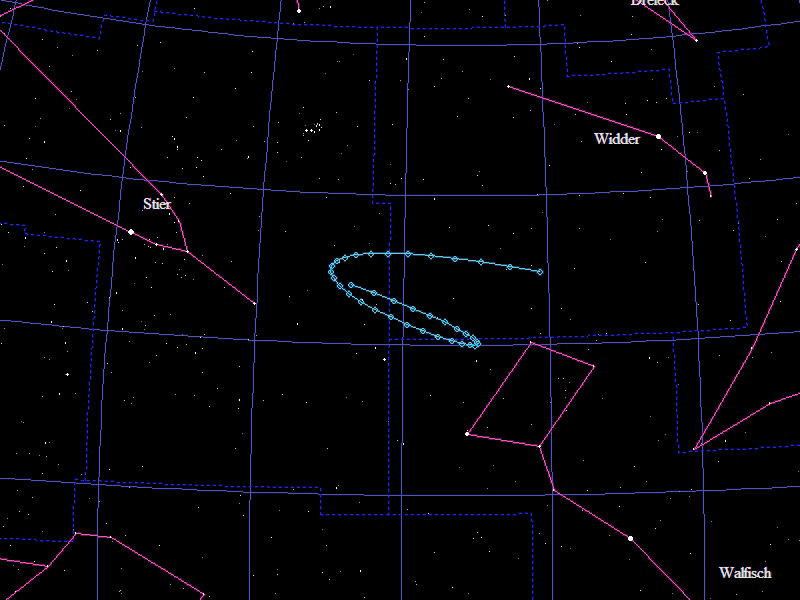 Die Oppositionsschleife von (29483) Boeker im Jahr 2016 im Grenzgebiet der Sternbilder "Widder" und "Stier". Eingezeichnet sind die Positionen zwischen dem 10.8.2016 und dem 5.2.2017 mit jeweils 5 Tagen Abstand. Die maximale Helligkeit des Kleinplaneten beträgt 17,6mag.