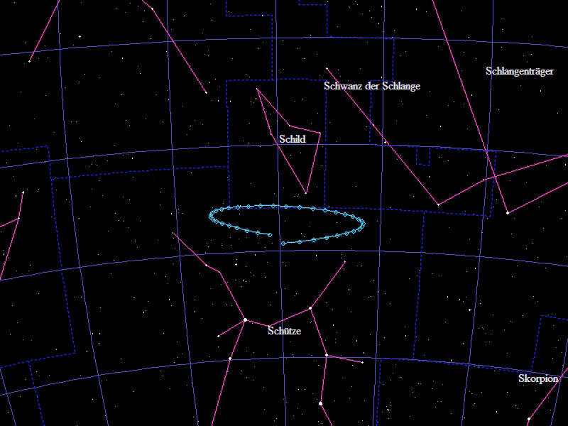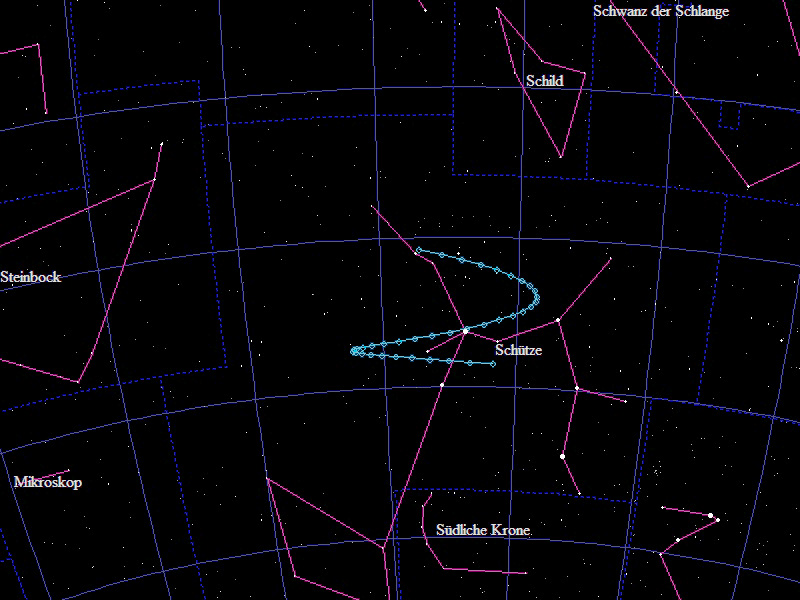 Die Oppositionsschleife von (29483) Boeker im Jahr 2023 im Grenzgebiet der Sternbilder "Schütze" und "Schild". Eingezeichnet sind die Positionen zwischen dem 5.4. und dem 1.10.2023 mit jeweils 5 Tagen Abstand. Die maximale Helligkeit des Kleinplaneten beträgt 18,7mag.
