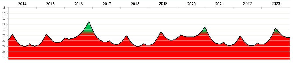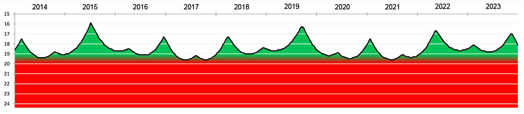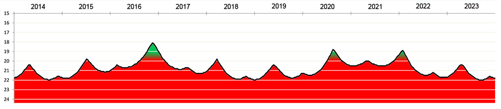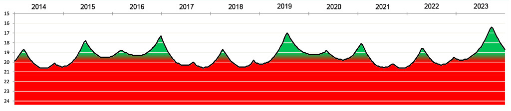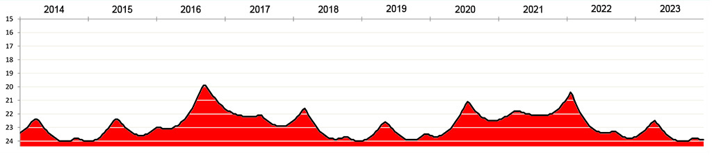 Die Helligkeit des Kleinplaneten (15924) Axelmartin zwischen 2014 und 2023.