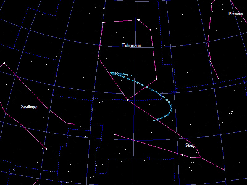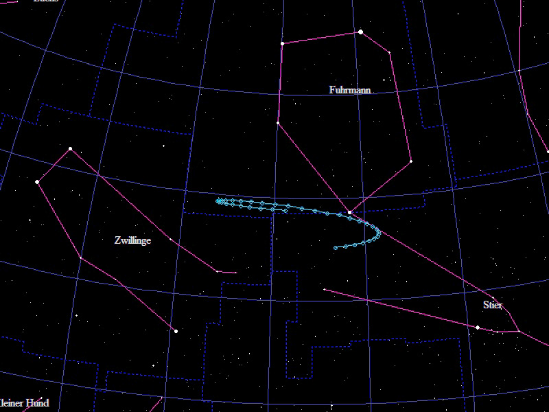 Die Oppositionsschleife von (12053) Turtlestar im Jahr 2016 im Grenzgebiet der Sternbilder "Stier", "Fuhrmann" und "Zwillinge". Eingezeichnet sind die Positionen zwischen dem 15.9.2016 und dem 13.3.2017 mit jeweils 5 Tagen Abstand. Die maximale Helligkeit des Kleinplaneten beträgt 17,3mag.
