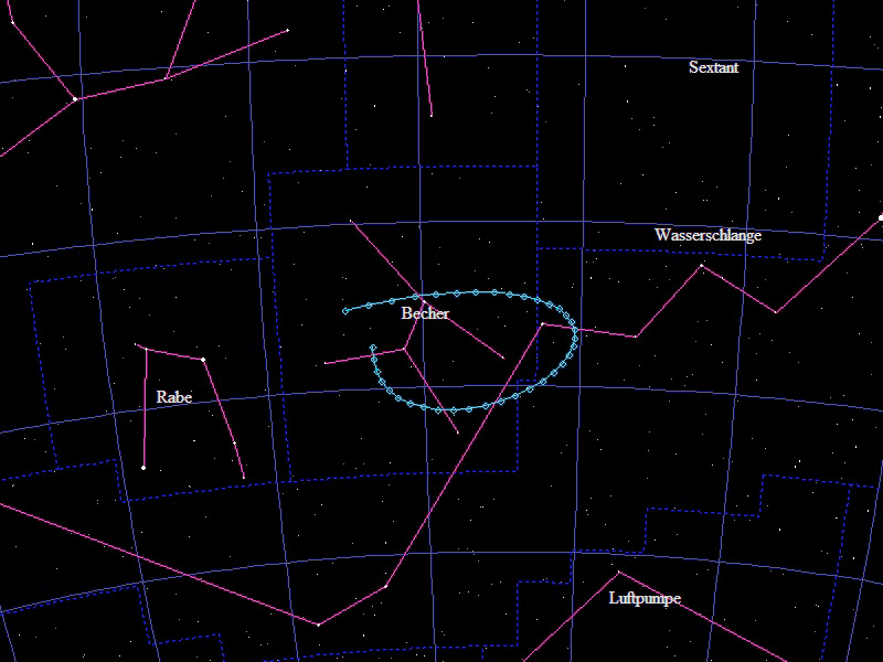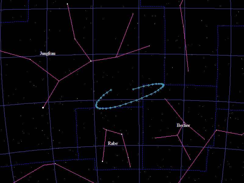 Die Oppositionsschleife von (133552) Itting-Enke im Jahr 2017 im Grenzgebiet der Sternbilder "Becher" und "Wasserschlange". Eingezeichnet sind die Positionen zwischen dem 15.1. und dem 13.7.2017 mit jeweils 5 Tagen Abstand. Die maximale Helligkeit des Kleinplaneten beträgt 18,8mag.
