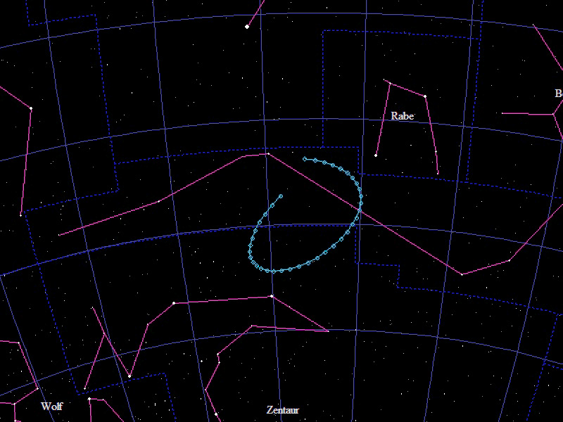 Die Oppositionsschleife von (133552) Itting-Enke im Jahr 2023 im Grenzgebiet der Sternbilder "Wasserschlange" und "Zentauer". Eingezeichnet sind die Positionen zwischen dem 15.1. und dem 13.7.2023 mit jeweils 5 Tagen Abstand. Die maximale Helligkeit des Kleinplaneten beträgt 19mag.