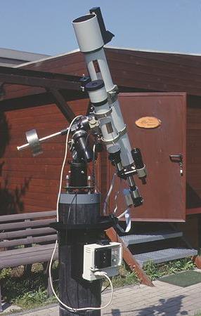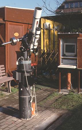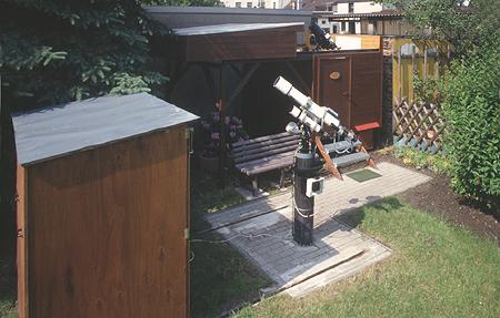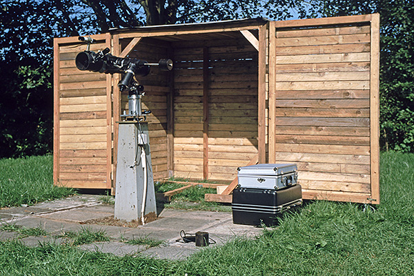 Nach Austausch der Super-Polaris Montierung gegen eine G-11 konnte nun auch bei längeren Belichtungszeiten noch punktförmig nachgeführt werden. Im Hintergrund ist die bereits im August fertiggestellte Computerhütte zu erkennen.