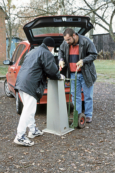 Eine von uns organisierte alte Pyramidenstumpf-Säule aus Stahlblech mit Betonfüllung dient als Unterbau der New-Polaris-Monierung unserer "Außenstelle Nord". Dank des vorbereiteten Betonfundaments und einer von uns angefertigten Adapterplatte für die Montierung kann das Teleskop bis zum Nachmittag komplett aufgestellt werden. Später entsteht dann auch noch ein abfahrbarer Wetterschutz, der nach dem gleichen Prinzip wie unsere abschiebbare Schutzhütte für den 4"-Refraktor funktioniert.