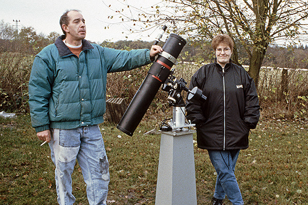 Ilonka Rohacek und Cyril Holtz neben ihem neu aufgestellten Teleskop