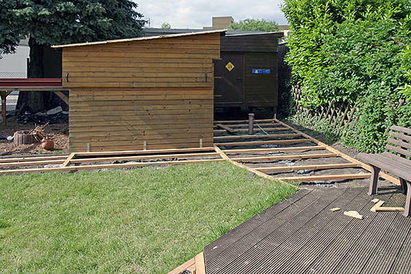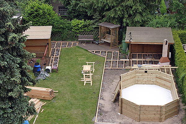 Gegen Ende des Monats beginnen wir mit der Umgestaltung des hinteren Gartenbereichs. Neben dem Bau eines Swimmingpools sollen auch der bereits vorhandene Grillplatz und die beiden Sternwartenhütten über ein hölzernes Terrassendeck mit dem bereits bestehenden Plattenweg verbunden werden. Gerade in den feuchten Frühlings- und Herbstnächten muss man so in Zukunft nicht mehr durch das nasse Gras laufen.