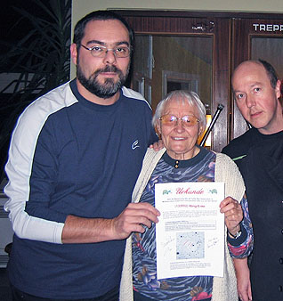 Durch gemeinsame Bekannte erfuhren wir Anfang des Monats, dass sich die Namenspatin unseres Kleinplaneten in ihrem Geburtsort Probstzella in Thüringen aufhielt. Ohne den wahren Grund zu verraten wurde kurzerhand ein Treffen organisiert in dessen Verlauf wir eine selbstgestaltete Benennungsurkunde überreichten.
